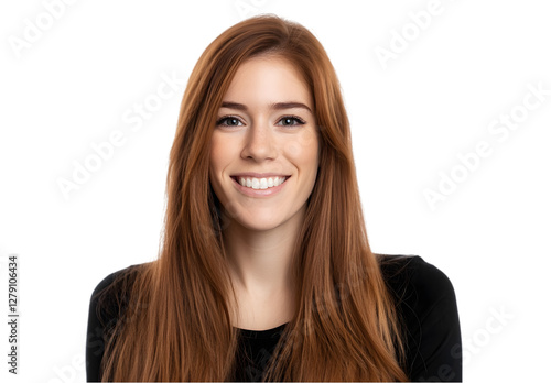 a beautiful, smiling woman with long, straight hair looking at the camera, isolated on a white background