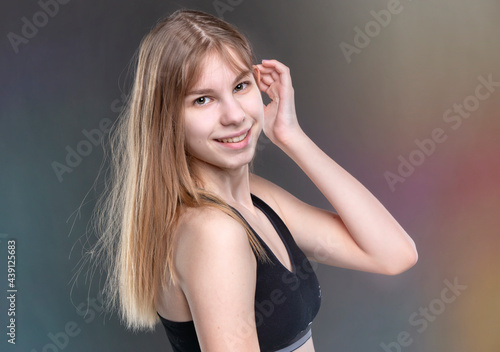 A beautiful teenage girl in a sports undershirt on a gray background looks at the camera and smiles.