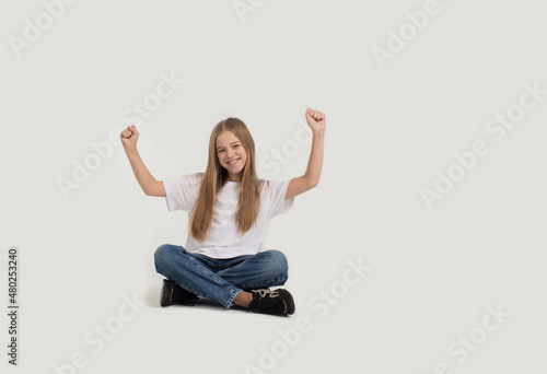 a beautiful teenage girl in a white T-shirt and blue jeans is sitting on a white background