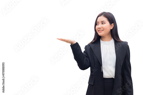 A beautiful Thai Asian woman in a suit is crossing her arms, spreading her hands and looking to her left. with white background
