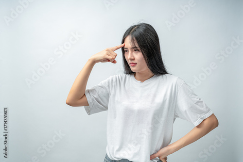 A beautiful woman has a serious expression and uses both his hands to hold his head due to accumulated stress. This is suitable for concepts related to healthcare, medical, advertising and lifestyle.