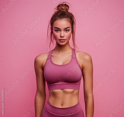 A beautiful woman in yoga pants is posing for the camera, against a pink background
