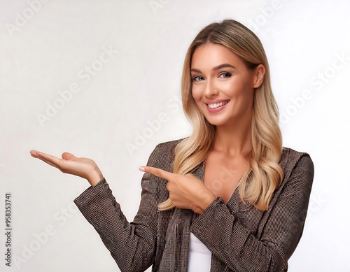 A Beautiful woman pointing to show product in studio on white background