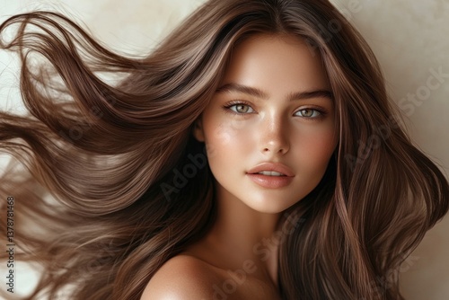 A beautiful woman showcases her long, flowing brown hair in a softly lit setting, emphasizing her captivating features and serene expression