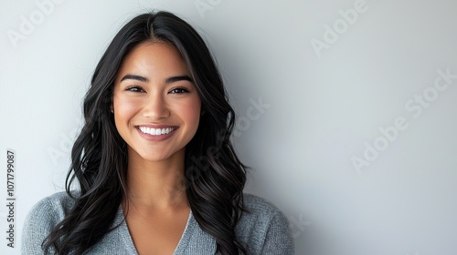 A Beautiful Woman Smiling Brightly Against a Plain Background, Radiating Joy and Confidence in a Well-Lit, Isolated Setting Perfect for Stock Photography Use