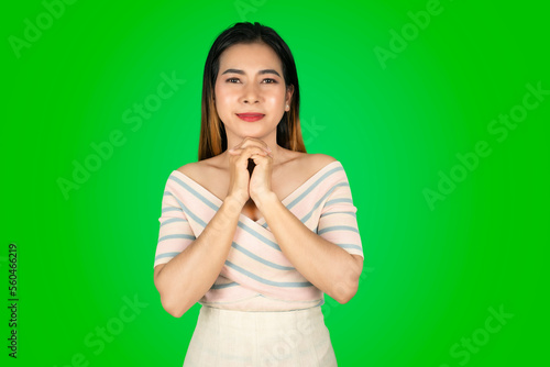 A beautiful woman stands with her arms folded under her chin