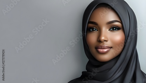 A beautiful woman wearing a dark hijab smiles gently