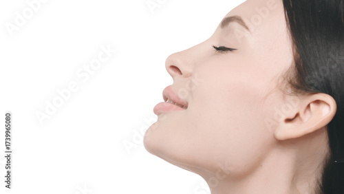A beautiful woman with clear skin poses elegantly against a white background, radiating natural beauty and grace, emphasizing skincare and self-care with a calm expression.