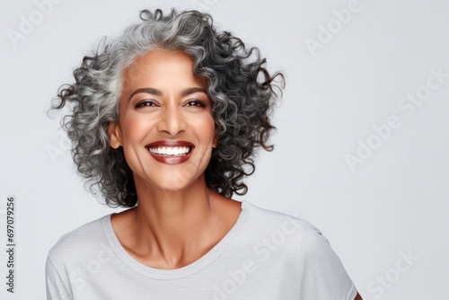 a beautiful woman with smooth butter-like glowing skin and her long grey hair bouncing. wearing a grey and white shirt. in front of bright white background