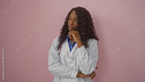 A beautiful young african american woman with curly hair in a white coat stands thoughtfully against an isolated pink background.