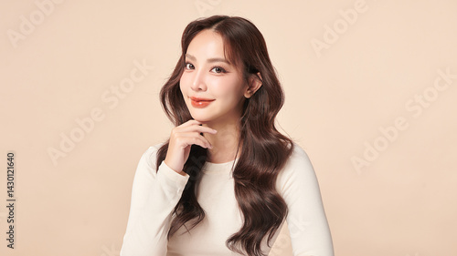 A beautiful young Asian woman with clean, fresh skin against a beige background. Skincare, facial treatment, cosmetology, beauty, and spa. An elegant portrait of an Asian woman.