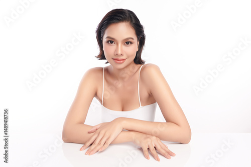 A beautiful young Asian woman with clean, fresh skin against a white background. Skincare, facial treatment, cosmetology, beauty, and spa. An elegant portrait of an Asian woman.
