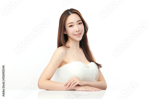A beautiful young Asian woman with clean, fresh skin against a white background. Skincare, facial treatment, cosmetology, beauty, and spa. An elegant portrait of an Asian woman.