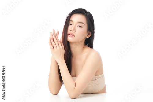 A beautiful young Asian woman with clean, fresh skin against a white background. Skincare, facial treatment, cosmetology, beauty, and spa. An elegant portrait of an Asian woman.