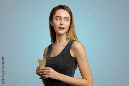 A beautiful young girl in a black dress holds a glass of champagne with both hands and looks away with a smile. Studio portrait on isolated blue background