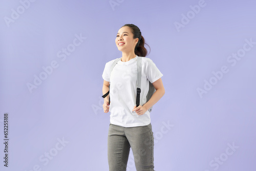 A beautiful young happy asian woman posing isolated over violet background with backpack.