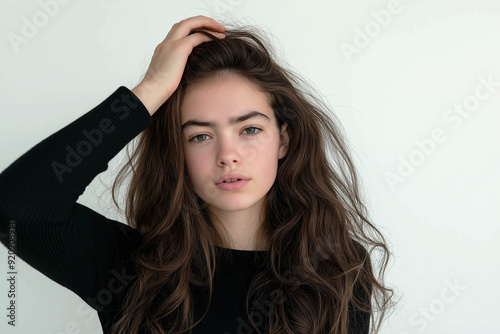 A beautiful young woman of Jewish appearance holds her head, she has a headache, on a white background, medium plan.