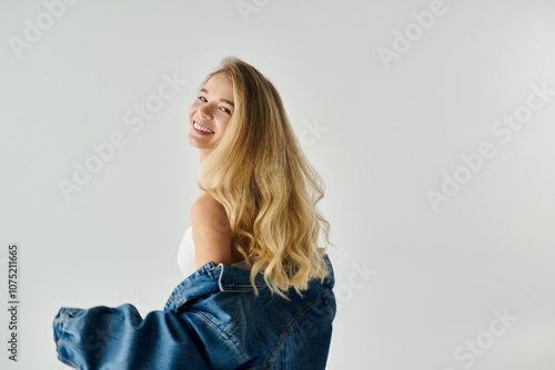 A beautiful young woman smiles brightly while wearing a trendy denim jacket, radiating happiness.