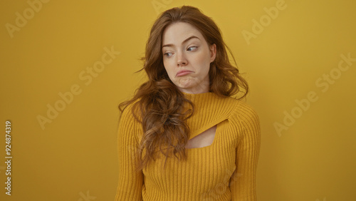 A beautiful young woman with blonde hair makes a pouting expression against an isolated yellow background wall.