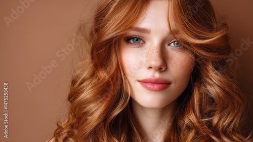 A beautiful young woman with vibrant red hair and stunning blue eyes gazes directly at the viewer, exuding confidence and charm in a softly lit environment with warm tones