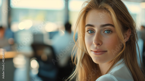 A blond woman with blue eyes in an office looking at camera blur office background