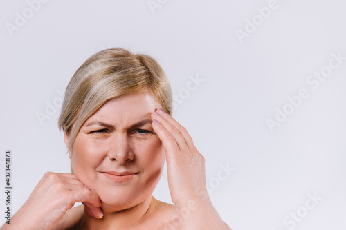 A blonde senior woman with a frown looks at the displeased wrinkles on her face. White background. An enlarged portrait with side space. Anti aging, spa and beauty