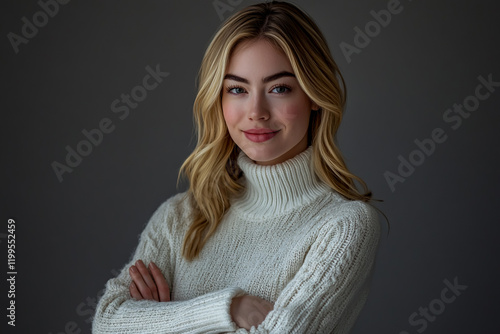 A blonde woman in a white sweater with her arms crossed, looking at the camera and smiling against a grey background