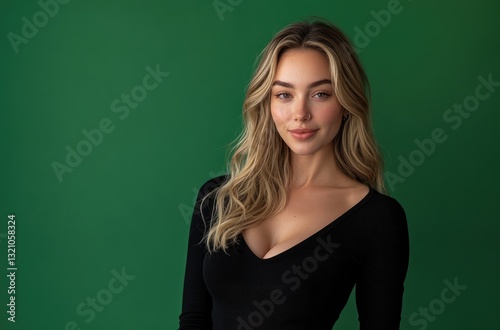 A blonde woman posing while showing her midriff, in front of a green screen background, wearing a black long-sleeved shirt and a short skirt