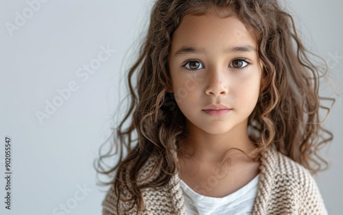 A Brazilian girl with curly hair gazes directly at the viewer, showcasing her natural beauty and simple attire in a calm indoor environment