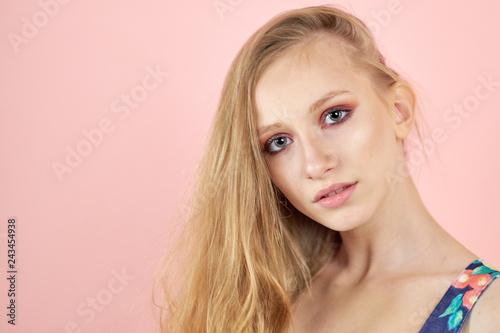 A bright girl isolated on a pink background