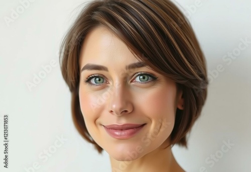 A calm and serene portrait of a woman with short hair