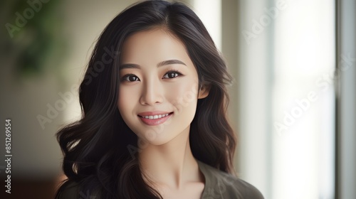 a captivating Asian woman with a captivating smile, her eyes twinkling with mischief and allure, her elegant makeup highlighting her playful personality.