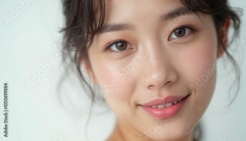 A captivating close-up portrait of an Asian woman showcases her radiant beauty and confidence.