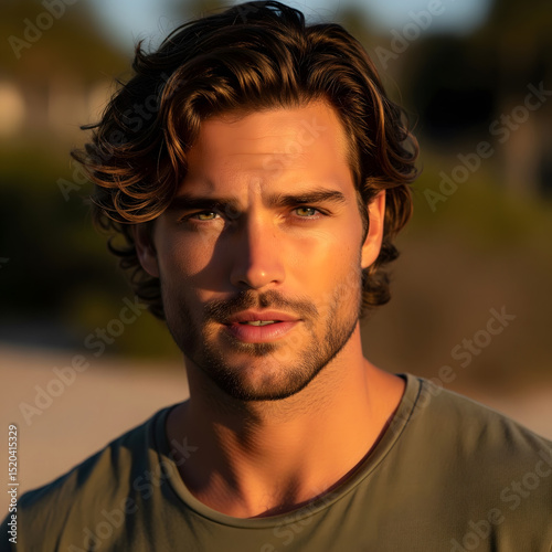 A captivating male, appearing in his late twenties, with well-groomed medium-length wavy hair and a confident, alluring gaze