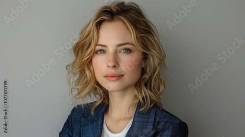 A captivating portrait of a young woman with curly hair posing elegantly against a muted background. Generative AI