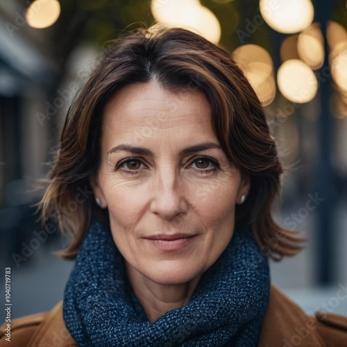 A Caucasian brunette French woman 50 - 60 years old with medium length hair up to shoulders stands in a quaint French street. The scenery embodies a serene and joyful atmosphere. Generative AI
