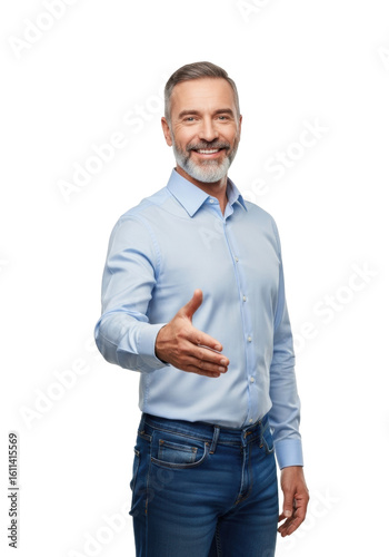 A caucasian man, late 40s, grey beard, light blue shirt, dark jeans, extends hand for a handshake, smiling warmly at the camera against a transparent background with copy space, concept of welcome