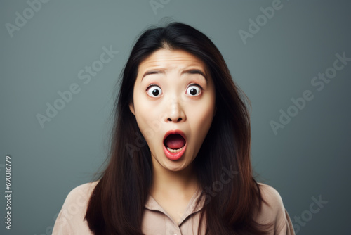A charming Asian woman with a surprised expression has an unexpected expression of surprise on her face against a lively studio background.