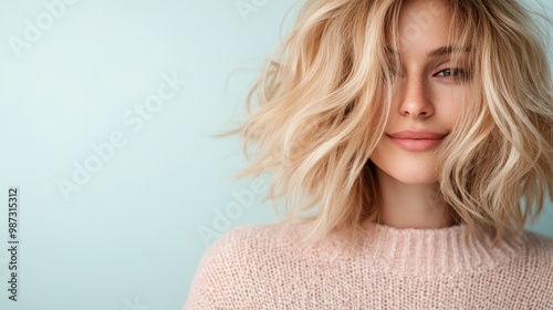 A charming woman with pastel pink hair beams a sweet smile, reflecting playfulness and charm, set against a serene backdrop, an embodiment of modern style.