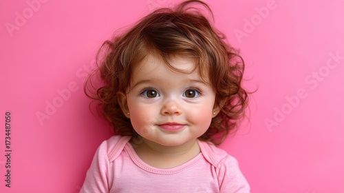 A charming young child, around one or two years old, looks directly at the viewer with a soft smile. The toddler wears a pink outfit against a vibrant pink backdrop
