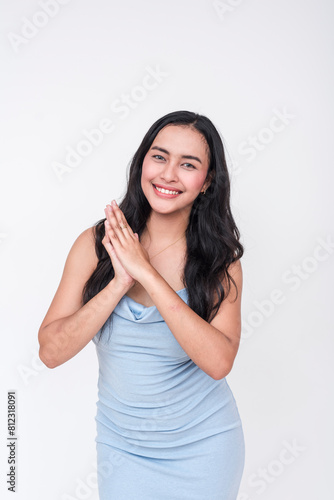 A cheerful Asian woman wearing a baby blue dress, standing with a joyful expression and clasped hands, isolated on a white background.