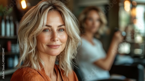 A cheerful blond woman enjoys a hair transformation at the salon, as her stylist expertly applies color to her locks.