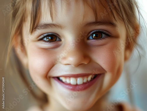 A cheerful child with a joyful smile in a close-up shot against a neutral background.
