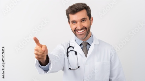 A cheerful doctor in a white coat confidently points forward, exuding friendliness and trust.