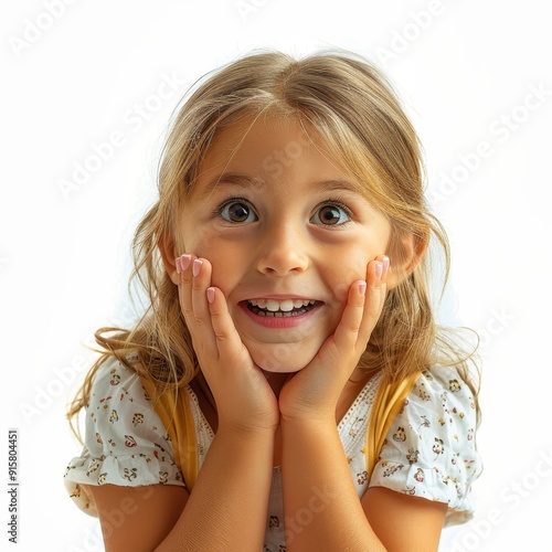 A cheerful girl with curly hair expressing joy and surprise in a bright indoor setting during the afternoon