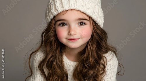 A cheerful little girl with long hair smiles brightly, dressed in a cozy winter sweater and hat, exuding warmth against a soft, light background