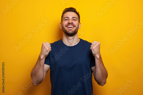 A cheerful man with a beard and short hair, wearing a blue t-shirt, raising both fists in celebration against a bright yellow background.
