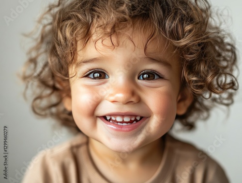 A cheerful toddler expresses pure joy and innocence with a beaming smile. Soft natural light highlights their bright eyes against a neutral background