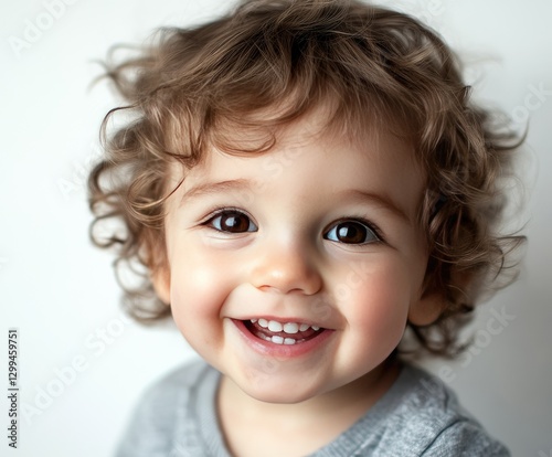 A cheerful toddler radiates happiness with a big smile, illuminated by soft natural light that emphasizes their bright eyes and pure joy in a neutral setting