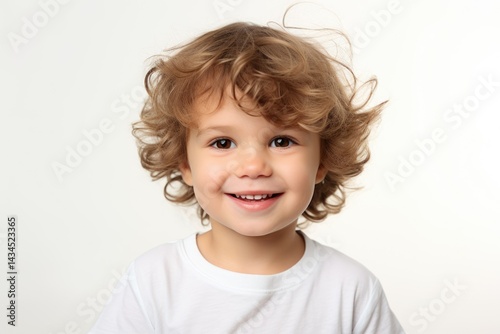 A cheerful toddler with curly brown hair smiles brightly at the camera, wearing a simple white t-shirt against a white background.